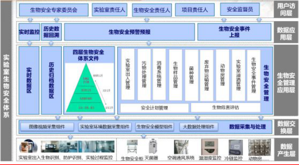 實驗室生物安全管理平臺充分利用圖像與視頻數(shù)據(jù)采集、物聯(lián)網(wǎng)、大數(shù)據(jù)處理、人工智能等信息化技術,為生物安全實驗室的生物安全提供了更加智能的管理方式。同時,生物安全管理平臺也為生物安全的各級主管單位、實驗室責任人等提供了實時、可視化的生物安全管理手段。