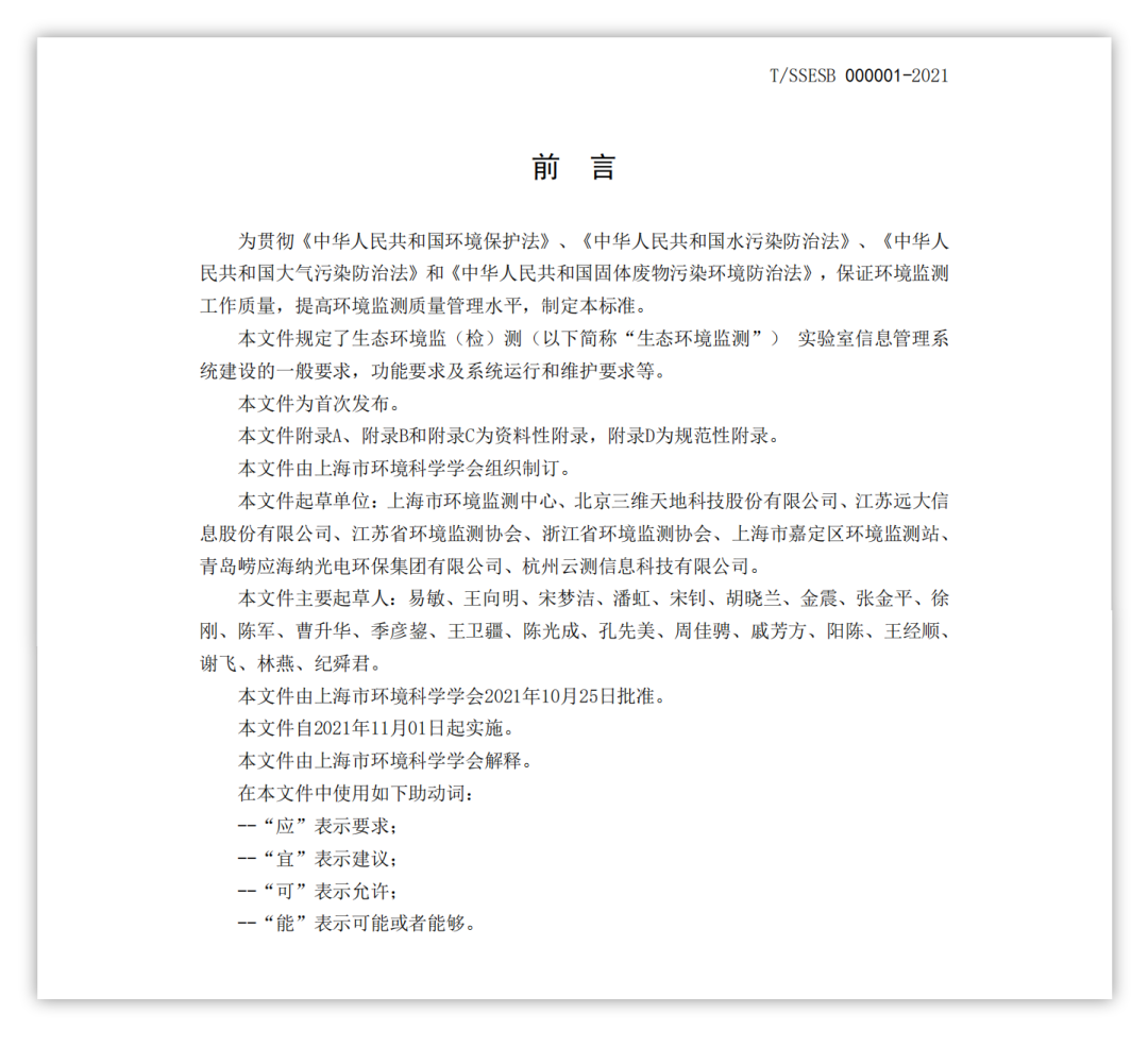 10月25日,由上海市環(huán)境監(jiān)測(cè)中心、北京三維天地科技股份有限公司及江蘇、浙江省環(huán)境監(jiān)測(cè)協(xié)會(huì)等八家單位共同起草的《生態(tài)環(huán)境監(jiān)測(cè)實(shí)驗(yàn)室信息管理系統(tǒng)建設(shè)技術(shù)指南》,經(jīng)上海市環(huán)境科學(xué)學(xué)會(huì)批準(zhǔn),將于2021年11月01日起正式實(shí)施。