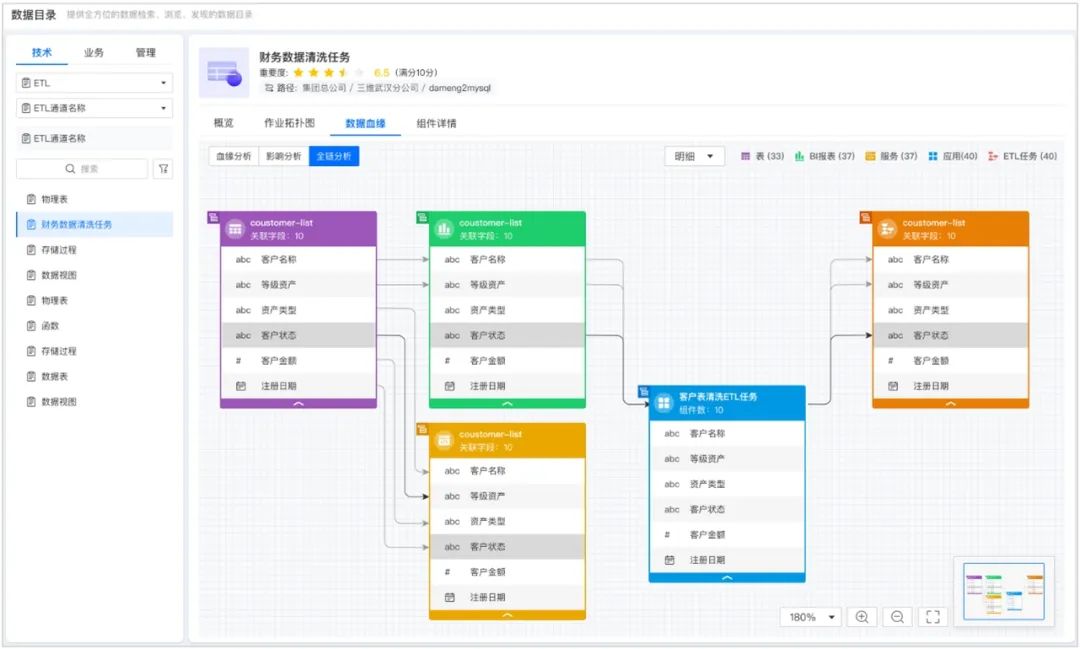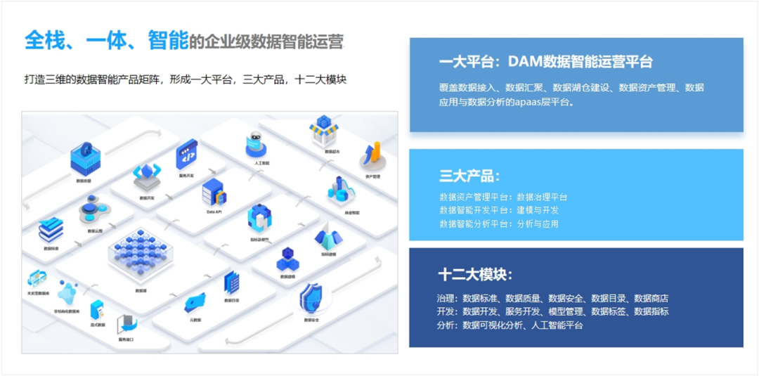 2023年10月26日,2023三維天地數(shù)據(jù)資產(chǎn)高峰論壇在北京成功舉辦。期間全新一代的數(shù)據(jù)資產(chǎn)管理平臺(DAM)v13正式與廣大用戶見面。 全新版DAM V13是基于客戶需求變化而進行的一次功能迭代。平臺吸收了100+項目實施過程中用戶提出的重要需求,進行統(tǒng)一歸納分析提煉,作為階段性需求進行新功能開發(fā),新版本將更貼合項目實際使用場景,在工具化,自動化、智能化的方向走出堅實的一步,以更好地表達三維天地的產(chǎn)品對于企業(yè)數(shù)字化轉(zhuǎn)型的支撐價值。 產(chǎn)品新增了數(shù)據(jù)指標、數(shù)據(jù)建模、數(shù)據(jù)標簽、人工智能四大模塊,強化數(shù)據(jù)治理、提升用戶洞察力,加速數(shù)據(jù)價值快速轉(zhuǎn)化的工具支撐;持續(xù)以主動元數(shù)據(jù)為核心,結(jié)合機器學習、深度學習、自然語言處理技術(shù),對多模塊功能細節(jié)進行匠心打磨,完善功能閉環(huán),功能點迭代數(shù)量80+,充分提升了智能化水平與數(shù)據(jù)管理效率。 在上一版本的基礎(chǔ)上,DAM V13平臺底座更夯實、數(shù)據(jù)治理更高效、數(shù)據(jù)開發(fā)更便捷、數(shù)據(jù)運營更智能,且擁有更標準及更為閉環(huán)的數(shù)據(jù)治理與智能數(shù)據(jù)分析解決方案。平臺具備搜索問答式數(shù)據(jù)分析系統(tǒng),問答式交互,搜索式體驗,將變革數(shù)據(jù)分析流程全場景的數(shù)據(jù)整合,讓數(shù)據(jù)“慧”說話;全鏈路協(xié)同的數(shù)據(jù)開發(fā)讓工具回歸為人服務(wù)的本質(zhì),全方位地提升一線數(shù)據(jù)開發(fā)人員/業(yè)務(wù)人員的工作效率。 DAM數(shù)據(jù)資產(chǎn)管理平臺是全棧、一體、智能的企業(yè)級數(shù)據(jù)智能運營平臺,形成了一大平臺、三大產(chǎn)品、十二大模塊的完整產(chǎn)品矩陣。主要包括治理、開發(fā)、分析三大產(chǎn)品,涵蓋數(shù)據(jù)目錄、數(shù)據(jù)標準、數(shù)據(jù)質(zhì)量、數(shù)據(jù)安全、數(shù)據(jù)開發(fā)、主數(shù)據(jù)建模、數(shù)據(jù)建模、指標建模、標簽建模、AI人工智能、BI商業(yè)智能、數(shù)據(jù)超市能等12大模塊,支持從數(shù)據(jù)治理到數(shù)據(jù)開發(fā)到數(shù)據(jù)分析的全鏈路的數(shù)據(jù)資產(chǎn)管理能力。 特性一:增強式數(shù)據(jù)目錄 傳統(tǒng)的數(shù)據(jù)資產(chǎn)目錄主要集中在結(jié)構(gòu)化數(shù)據(jù)庫表管理。而三維天地的數(shù)據(jù)目錄在此基礎(chǔ)上擴展了BI看板、ETL作業(yè)、主數(shù)據(jù)模型等類型,可以展示更多樣的數(shù)據(jù)對象,更細節(jié)的血緣關(guān)系,更及時的數(shù)據(jù)特征。 特性二:數(shù)據(jù)質(zhì)量的閉環(huán) 在以往項目實踐中,客戶不愁發(fā)現(xiàn)問題,而是更注重如何將發(fā)現(xiàn)的問題得以解決、將有問題的數(shù)據(jù)整改到位。因此平臺支持數(shù)據(jù)質(zhì)量的事前、事中、事后的閉環(huán)管理,即事前需求和規(guī)則定義、事中質(zhì)量監(jiān)控以及事后量化分析和問題追溯。 特性三:治理到自助式敏捷應(yīng)用的閉環(huán) 平臺具備從數(shù)據(jù)治理到自助式敏捷應(yīng)用的閉環(huán)一體化管理。在資產(chǎn)平臺中,數(shù)據(jù)治理結(jié)束后,平臺具備商業(yè)智能、人工智能、指標管理、標簽畫像以及智能應(yīng)用等各模塊,以滿足用戶的個性化應(yīng)用的構(gòu)建。當已有的應(yīng)用無法滿足訴求時,業(yè)務(wù)人員也可通過數(shù)據(jù)超市自助獲取數(shù)據(jù)、自助分析數(shù)據(jù)。實現(xiàn)治理到分析的全流程閉環(huán)應(yīng)用。 特性四:基于知識圖譜的增強數(shù)據(jù)治理 平臺結(jié)合AI、知識圖譜,有效提高了數(shù)據(jù)治理的效率,如業(yè)務(wù)域自動分類、數(shù)據(jù)標準自動生成、數(shù)據(jù)資產(chǎn)推薦、智能血緣推薦等,智能化的功能貫穿數(shù)據(jù)資產(chǎn)平臺的方方面面。 特性五:數(shù)據(jù)資產(chǎn)合理評估及入表 在數(shù)據(jù)資產(chǎn)入表的大背景下,產(chǎn)品適時推出自研的數(shù)據(jù)資產(chǎn)評估模型,通過對數(shù)據(jù)資產(chǎn)的成本因素、場景因素、市場因素和質(zhì)量因素等方面進行多維分析評估,為數(shù)據(jù)資產(chǎn)合理定價及市場流通奠定基礎(chǔ)。 特性六:數(shù)據(jù)開發(fā)和治理一體化 企業(yè)在以往數(shù)據(jù)中臺的建設(shè)效果不顯著。全新平臺將數(shù)據(jù)治理的流程與數(shù)據(jù)開發(fā)的全生命周期深度融合,通過數(shù)據(jù)開發(fā)一體化,在數(shù)據(jù)標準驅(qū)動模型構(gòu)建基礎(chǔ)上,有序高質(zhì)量地進行數(shù)據(jù)生產(chǎn),在數(shù)據(jù)開發(fā)過程中,完成數(shù)據(jù)治理。實現(xiàn)“標準即設(shè)計,設(shè)計即開發(fā),開發(fā)即治理”的開發(fā)治理一體化理念。 特性七:高效、輕量化的指標建模 過去指標的建設(shè),依賴開發(fā)人員手工編寫sql,業(yè)務(wù)人員用BI畫報表,不同人員對于業(yè)務(wù)指標存在不同的理解,產(chǎn)生的結(jié)果各異,既不便于統(tǒng)一管理,更難于進行問題溯源。 特性八:指標管理+BI實現(xiàn)指標中臺體系化 指標結(jié)合BI平臺,實現(xiàn)基于指標的可視化展現(xiàn);兩者相輔相成,指標賦能B