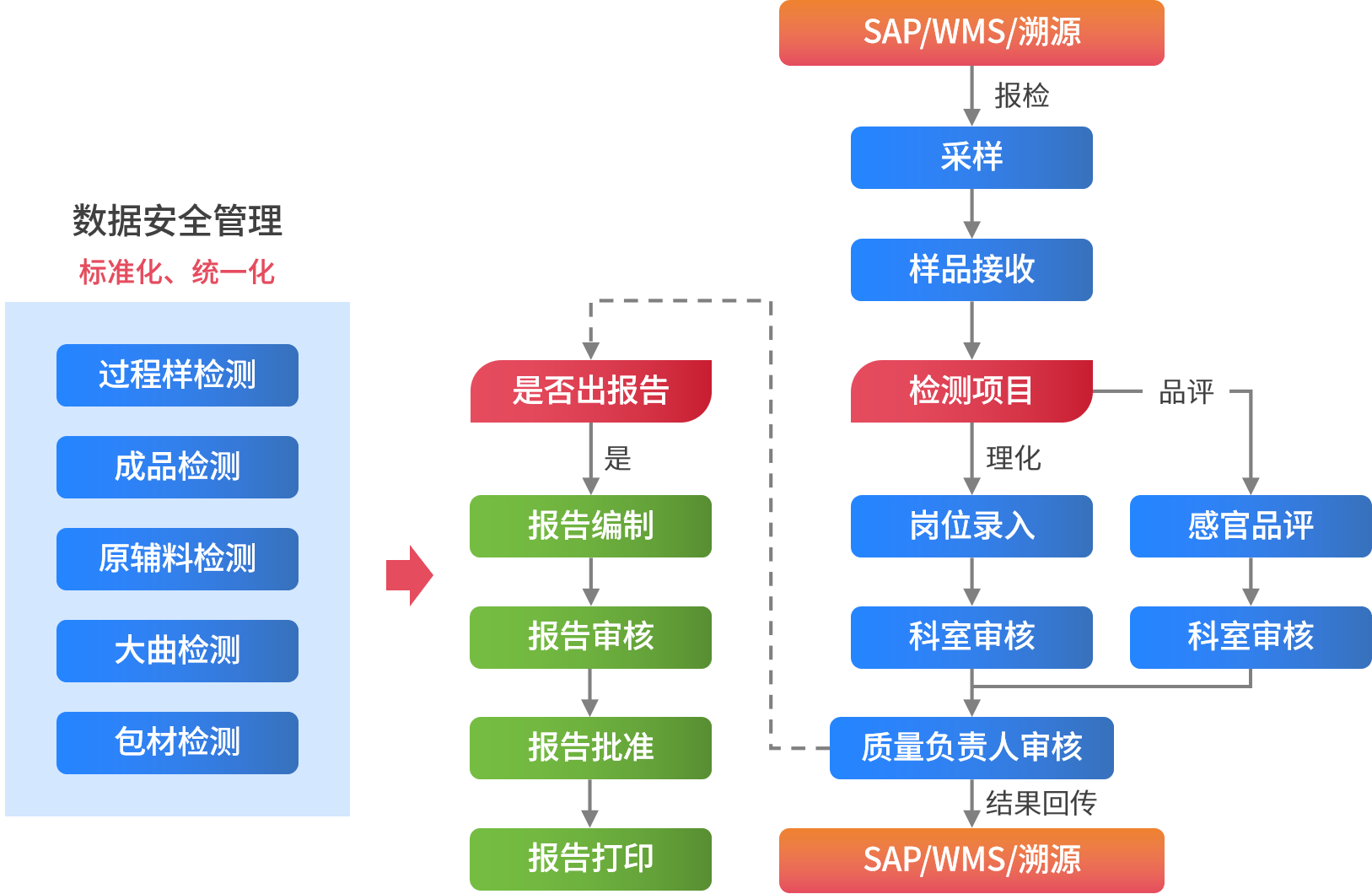 通過(guò)融合先進(jìn)的數(shù)字化實(shí)驗(yàn)室管理理念、規(guī)范和方法,SW-LIMS結(jié)合白酒行業(yè)企業(yè)的實(shí)際業(yè)務(wù)管理需要,對(duì)檢驗(yàn)業(yè)務(wù)流程進(jìn)行優(yōu)化,對(duì)現(xiàn)有檢驗(yàn)管理方式(如線(xiàn)下業(yè)務(wù)轉(zhuǎn)線(xiàn)上業(yè)務(wù),紙質(zhì)單據(jù)轉(zhuǎn)電子單據(jù)等)進(jìn)行改革,打通上下游系統(tǒng),實(shí)現(xiàn)報(bào)檢下樣、結(jié)果報(bào)出與企業(yè)現(xiàn)有系統(tǒng)自動(dòng)對(duì)接(如SAP、WMS、SRM,溯源等企業(yè)已有系統(tǒng)),使得業(yè)務(wù)流程設(shè)定更加靈活、規(guī)范、高效,更貼近實(shí)際業(yè)務(wù),實(shí)現(xiàn)對(duì)業(yè)務(wù)工作的可知、可控、可預(yù)測(cè)管理,實(shí)現(xiàn)對(duì)實(shí)驗(yàn)室資源的信息化管理,實(shí)現(xiàn)實(shí)驗(yàn)室業(yè)務(wù)的規(guī)范化、自動(dòng)化、數(shù)字化管理,且系統(tǒng)中各業(yè)務(wù)均支持自定義、可視化配置,進(jìn)一步提升了各檢驗(yàn)機(jī)構(gòu)的業(yè)務(wù)管理水平。