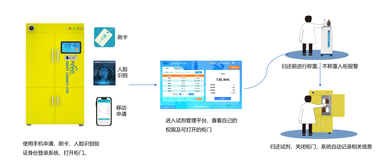 - ?;分悄芄芸兀踩珳?zhǔn)無(wú)憂:創(chuàng)新集成智能試劑柜、RFID標(biāo)簽及人臉識(shí)別技術(shù),構(gòu)建?;罚ㄈ缫字贫尽⒁妆罚┲悄馨踩芾黹]環(huán)。系統(tǒng)自動(dòng)校驗(yàn)實(shí)驗(yàn)人員試劑領(lǐng)取權(quán)限,實(shí)時(shí)智能核減庫(kù)存量,并實(shí)現(xiàn)耗材快速定位與自動(dòng)化盤點(diǎn),安全與效率雙提升。