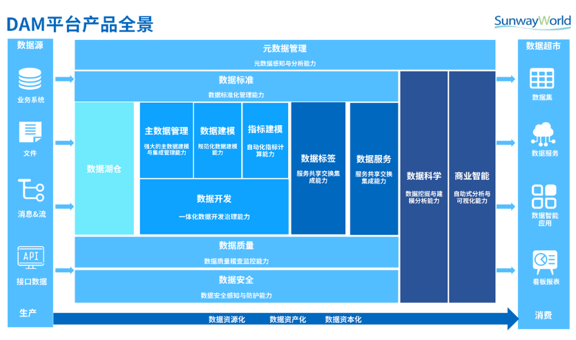 該平臺(Sunway-DAM V13)是三維天地借助大數(shù)據(jù)、機器學習、自然語言處理、知識圖譜等新興技術,在原有產(chǎn)品基礎上進行的全體系的智能化升級,構建的全棧、一體、智能的企業(yè)級平臺,形成了一大平臺、三大產(chǎn)品、十三大模塊的完整產(chǎn)品矩陣。